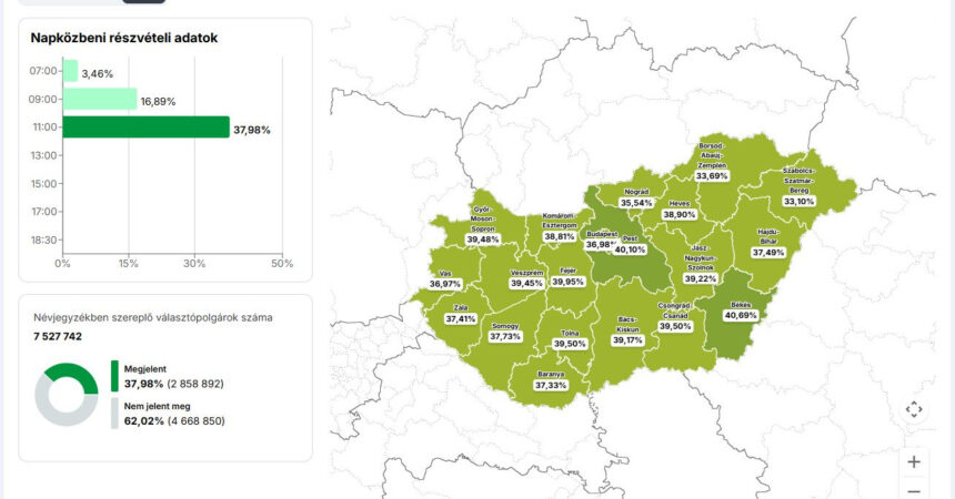 A Nemzeti Választási Iroda (NVI) adatai szerint Békés megye vezet 40,69 százalékkal, de Pest megye is átlépte a 40 százalékos küszöböt. Fejér megye 39,95 százalékkal a harmadik. A délelőtti 11 órai szám azon közel van ahhoz a 40,01 százalékhoz, amit négy évvel ezelőtt délután 1 órakor, tehát két órával később mérték. A részvétel lendülete azt jelzi, hogy a délutáni folyamatok és a végeredmény kialakulása is intenzívebb lehet, mint korábban várták.